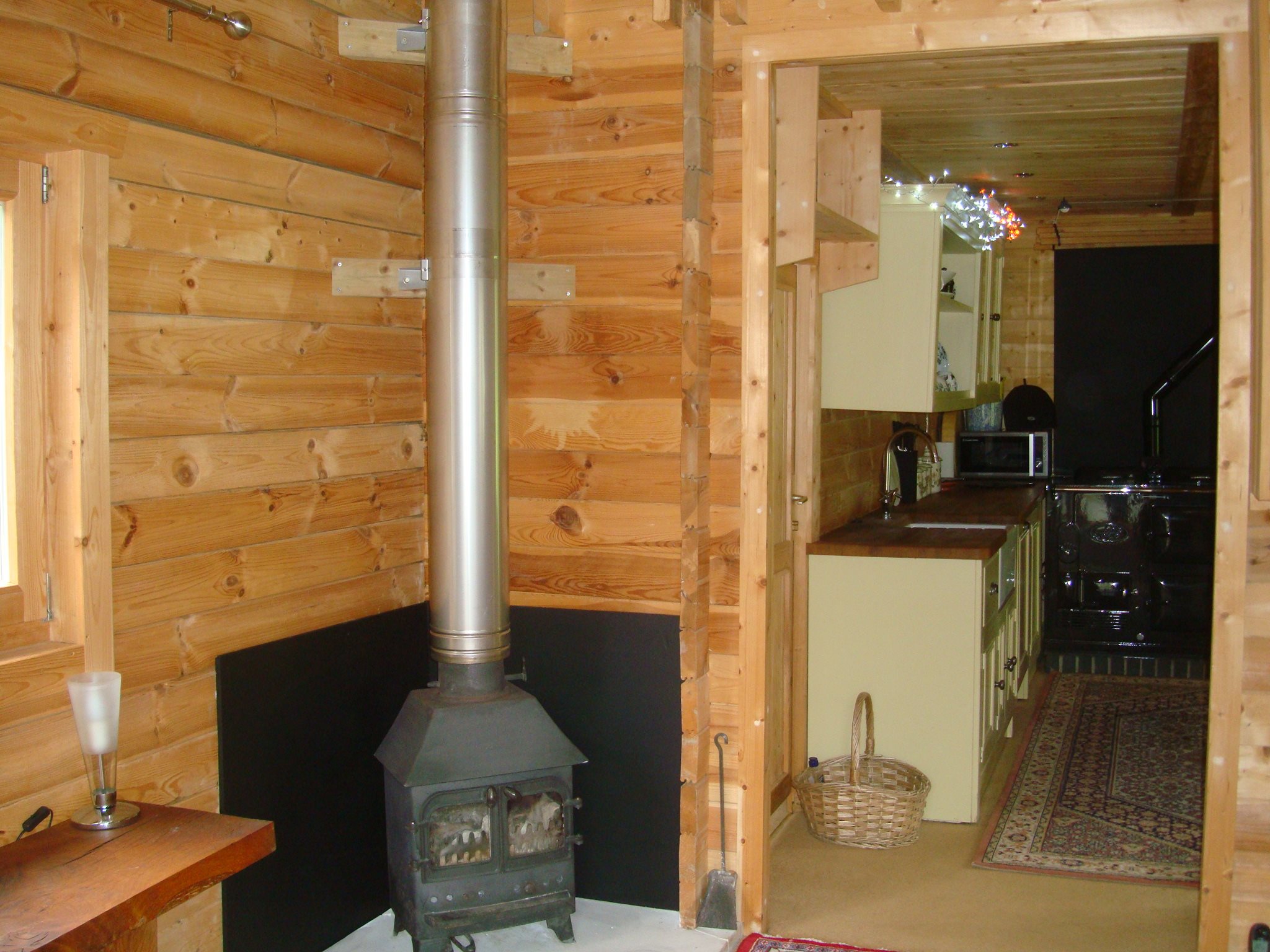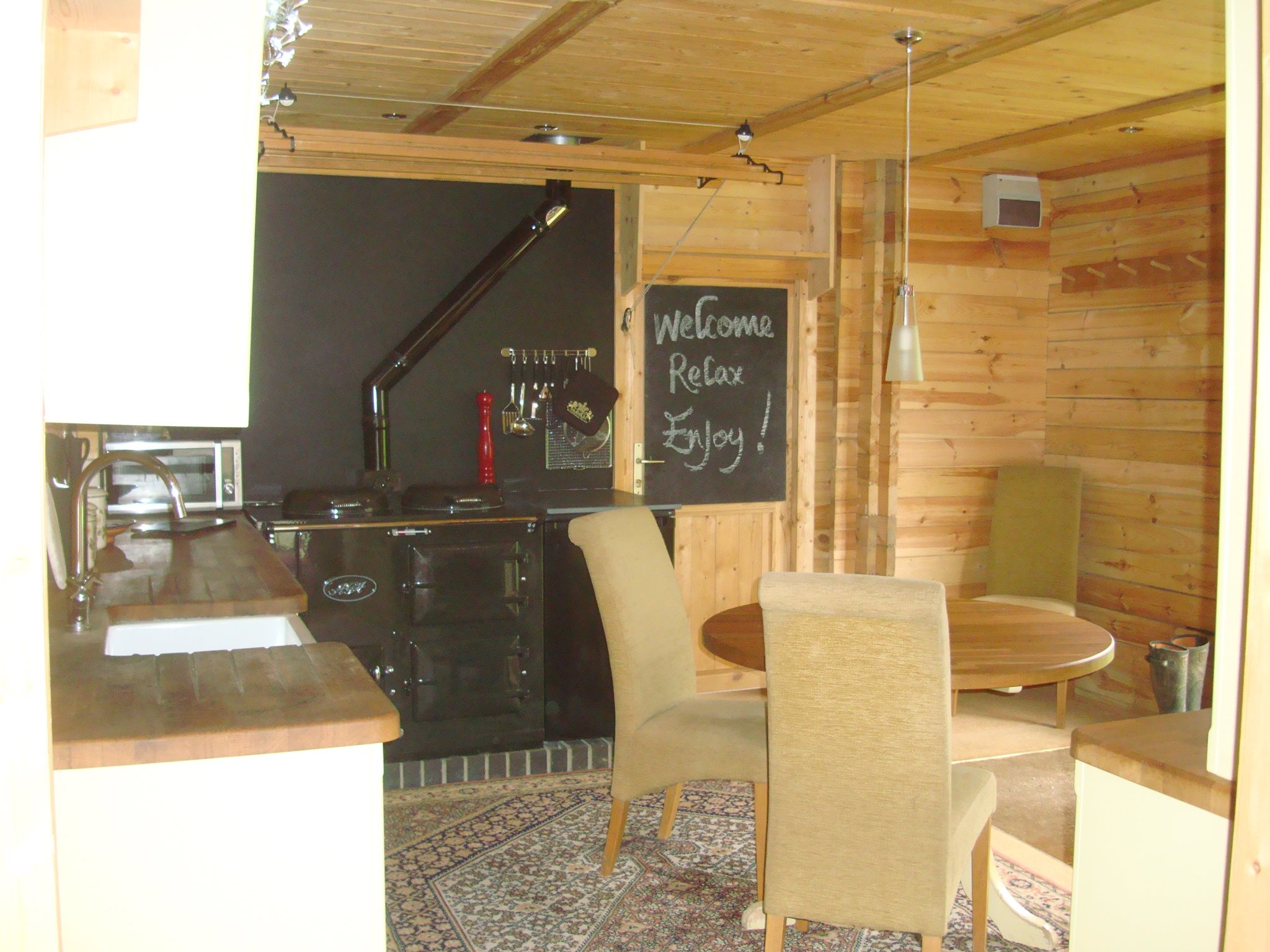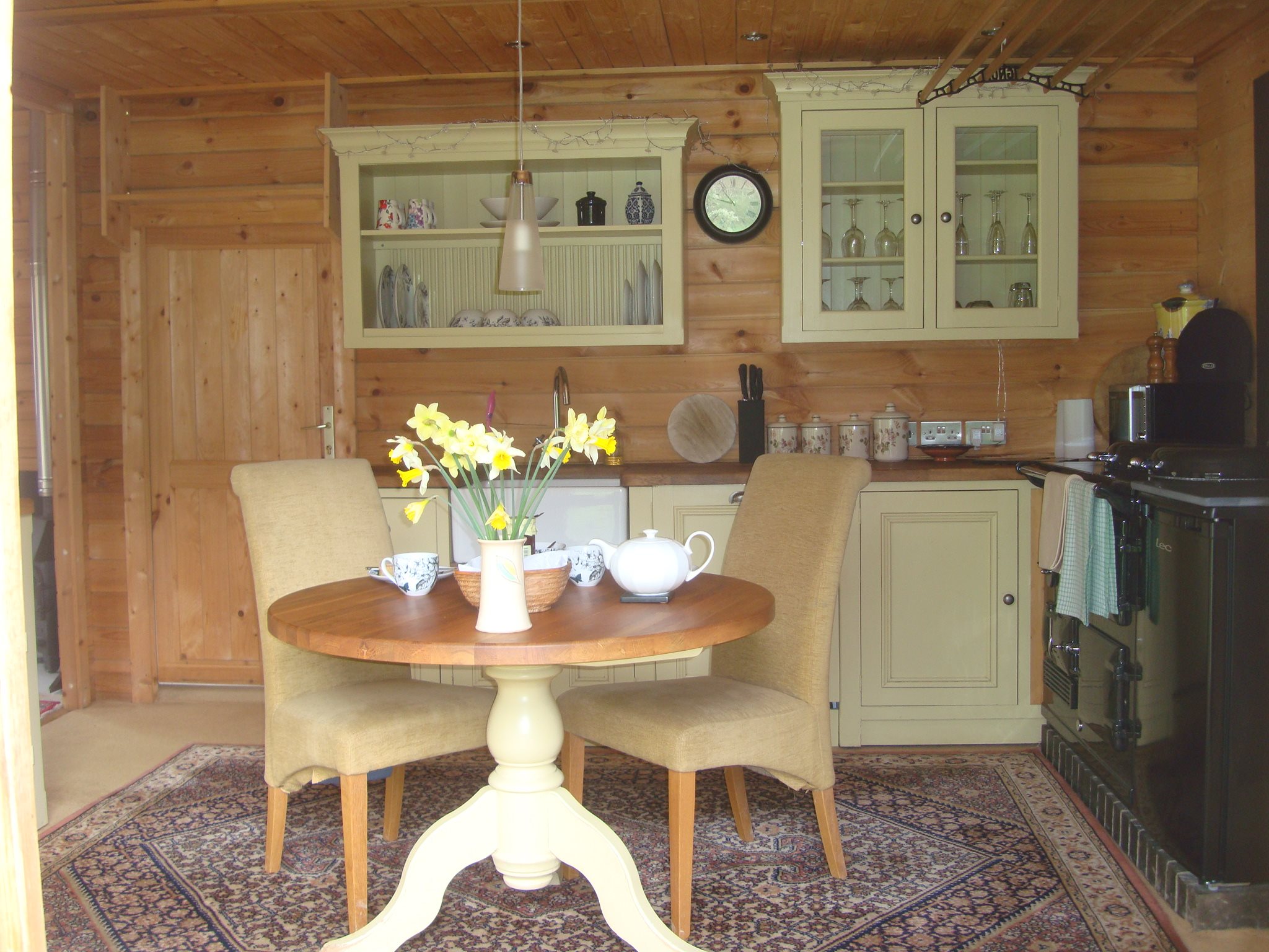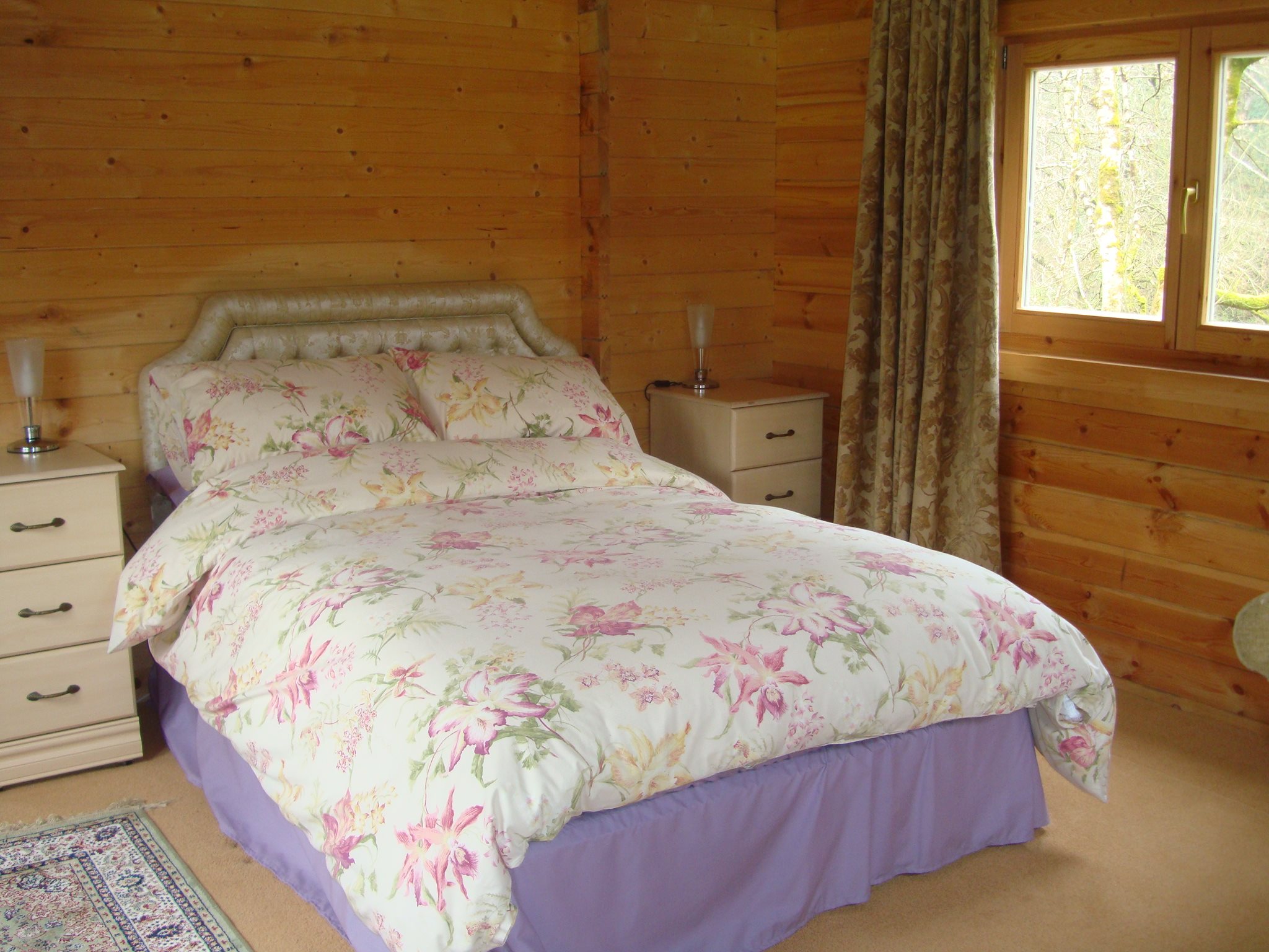 This lovely spacious, self catering, log cabin for two adults is beautifully furnished with antique Persian rugs, a top quality double bed with luxurious Egyptian cotton bedding, big soft fluffy towels, an extra deep double ended roll top bath, an oil fired Aga and a cosy wood burning stove.
