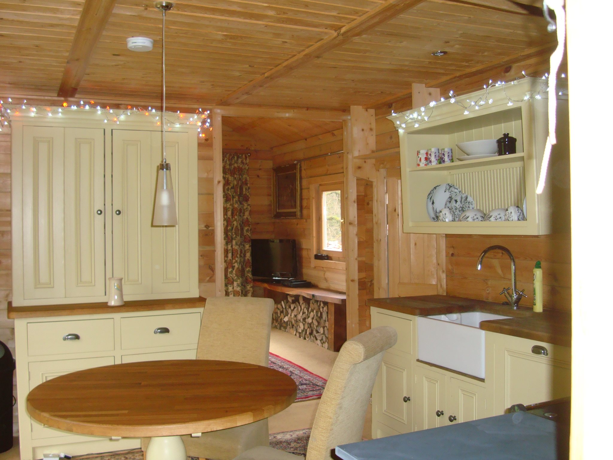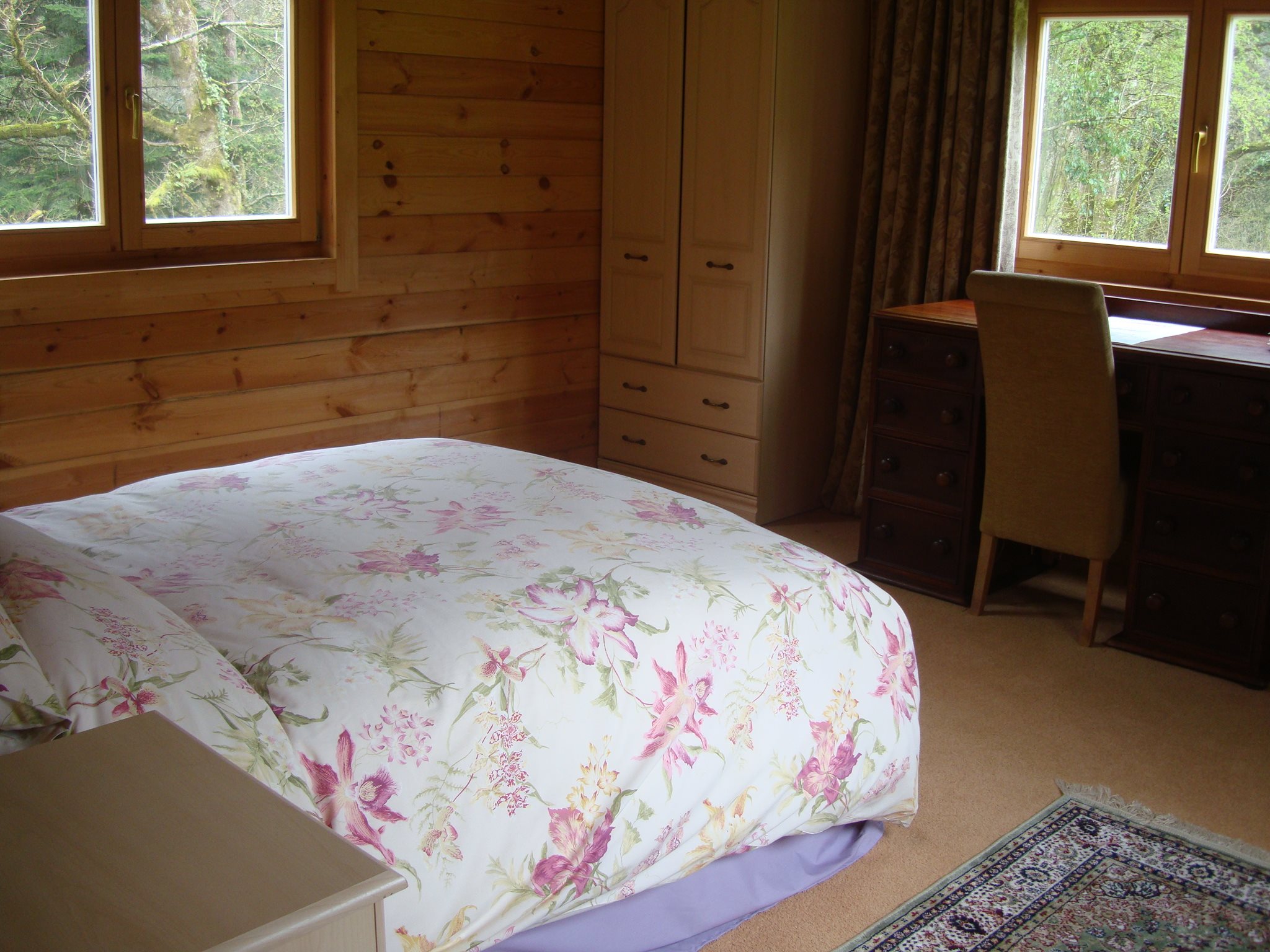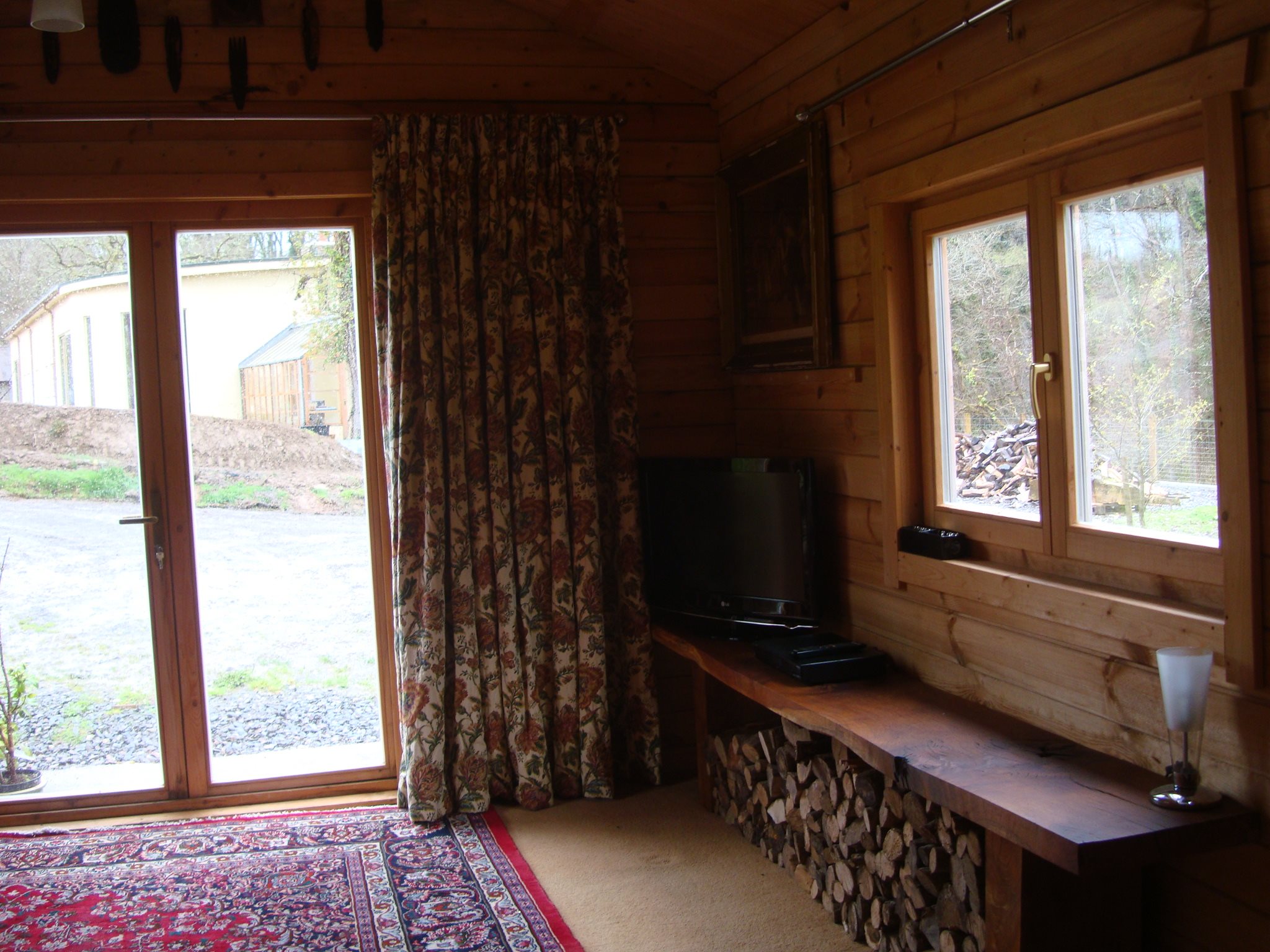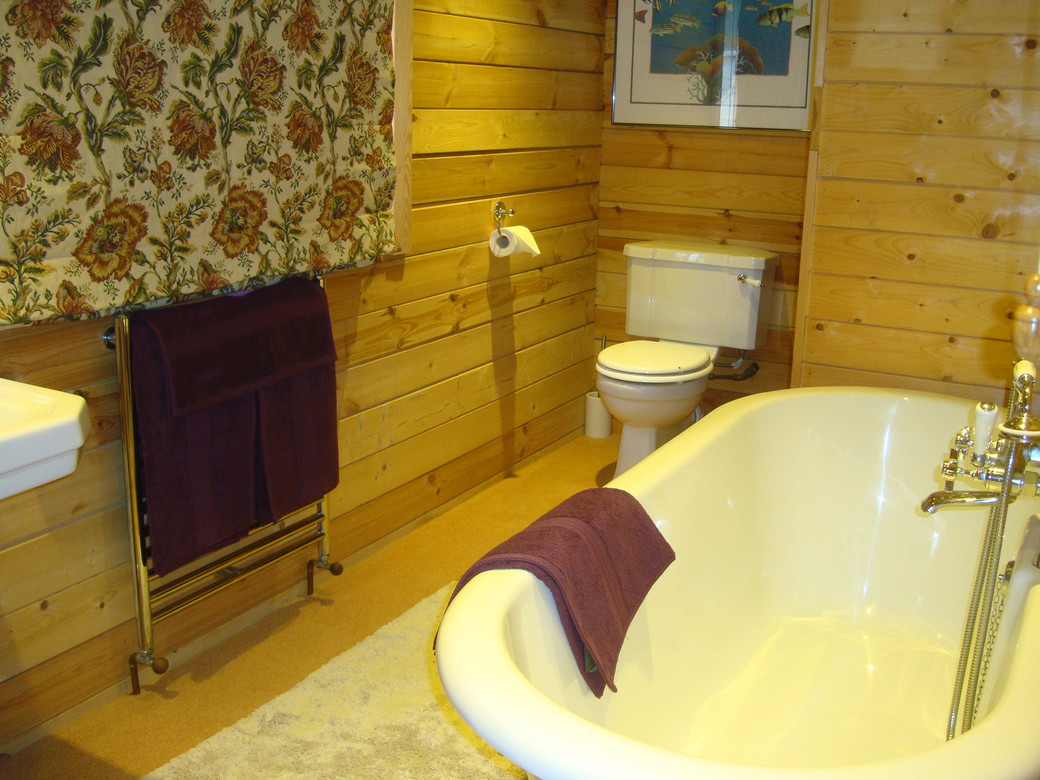 This lovely spacious, self catering, log cabin for two adults is beautifully furnished with antique Persian rugs, a top quality double bed with luxurious Egyptian cotton bedding, big soft fluffy towels, an extra deep double ended roll top bath, an oil fired Aga and a cosy wood burning stove.
